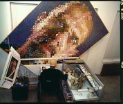 At the same time that the photographer and painter, Chuck Close, was painting his self portrait on a very large canvas for 82 days, The director was painting his cinematic portrait. He prepares a large Polaroid photograph of his face, which he divides to many small squares, and gradually he fills in the canvas with them. Contrary to other portraits, this time he has chosen lively colors, maybe in an attempt to color his image; an image known for the suffering associated with spending many years in a wheel chair after having a stroke, and the difficulty of moving the very hand that paints.