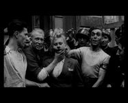 After the dizzying images of the blurred archive footage of World War Two, the artist and filmmaker, Jean-Gabriel Periot, takes us to the triumphant, victory marches in France; he shows us the happy expressions of celebration, which turn abruptly, into scenes of women, who, to the tune of La Marseillaise, have their heads shaved in the town square, as a sign of shame for their affairs with German soldiers.